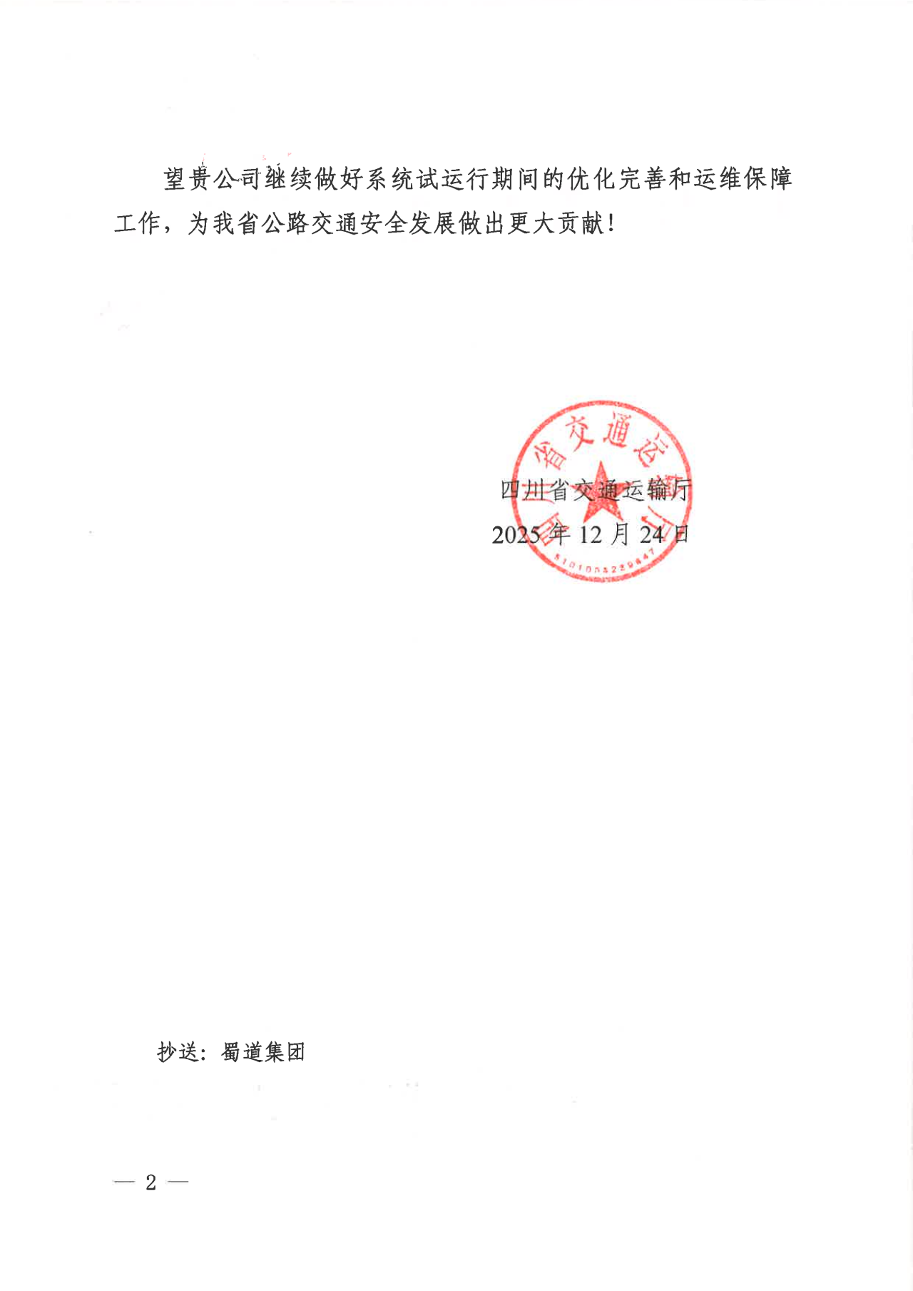 12月24日,四川云控收到来自四川省交通运输厅的感谢信。信中充分肯定公司在开发建设“四川省公路灾害监测预警系统V1.0”中所展现的专业素养、责任担当和积极贡献,并对公司持续做好系统优化和运维保障工作寄予厚望。